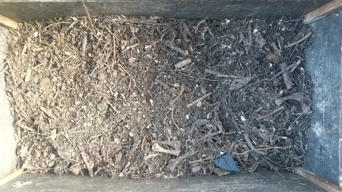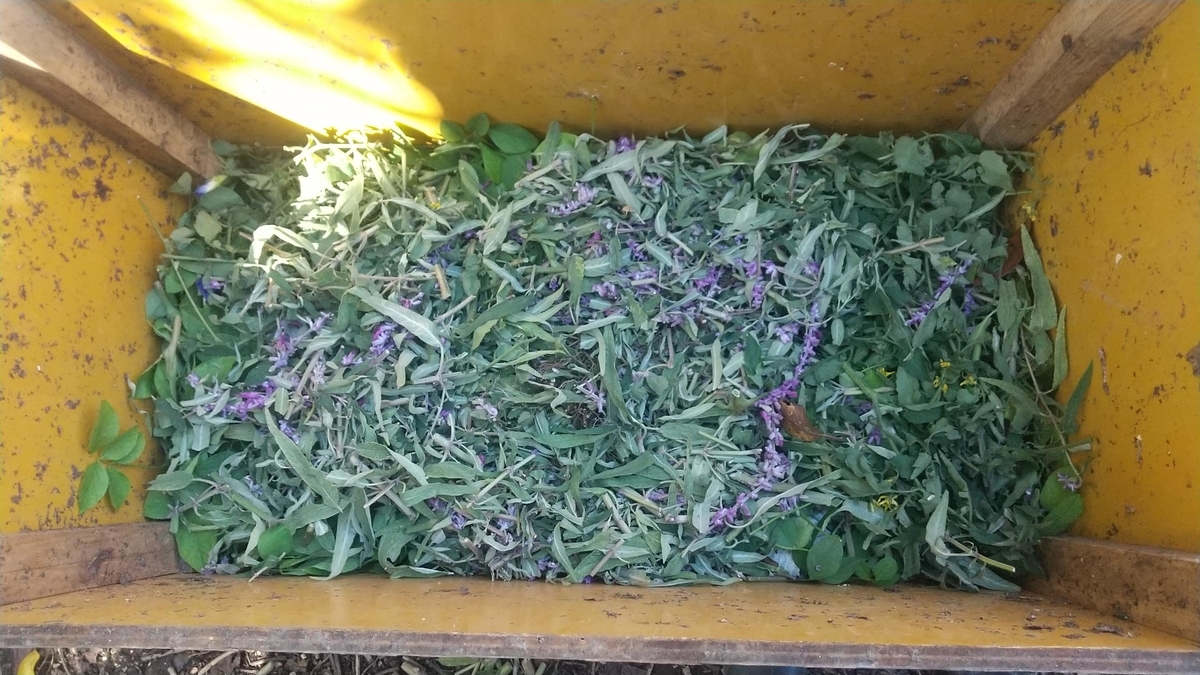 また、雑草も小さいものは引っ張って抜いてしまいますが、大きなものは決して引っ張って根から引っこ抜くことはしません。土の構造を壊してしまうからです。また、雑草を引き抜くことで、さらに雑草が生えやすい環境を作ってしまいます。土の中に埋まっていた雑草の種が、他の雑草を引き抜いたときに地表に現れ、発芽しやすくなってしまいます。雑草は増やしたくないのなら、決して抜くべきではありません。のこぎり鎌などで根元から切ります。切りとった部分は、土の上に敷き詰めるか、コンポスト枠に投入するかします。土がむき出しになるような場所なら刈った雑草を敷きますし、すでにコンポスト(堆肥という意味のコンポスト)が敷き詰められている場所ならば、刈った雑草はそこには敷かず、コンポスト枠に入れて堆肥化します。
