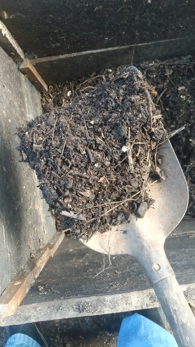 1つの植物の栽培が終わると、根元で切ります。根は地中に残ったまま、地表に分厚くコンポスト(堆肥)を敷き詰めます。最低でも5cm、完成した堆肥が十分あれば7~8cmは敷きたいです。そこに、セルトレイで育苗しておいたプラグ苗、またはポット苗を植えて、また次の栽培を始めます。土を耕して、肥料やらなんやら入れて…という作業がないため、1つの栽培が終わってすぐに次の栽培を始めることができます。